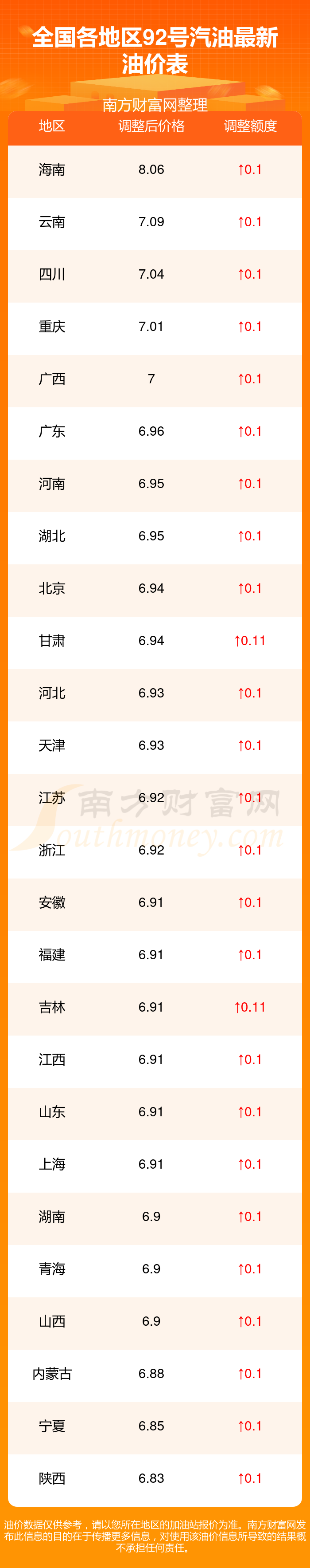 全國(guó)各地區(qū)最新92號(hào)汽油油價(jià)表