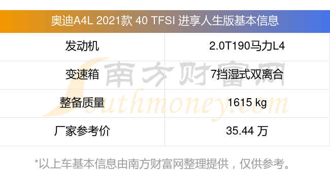 在動力方面,奧迪A4L 2021款 40 TFSI 進享人生版搭載的是一臺2.0T190馬力L4渦輪增壓發(fā)動機,匹配7擋濕式雙離合自動檔變速箱,燃料形式為汽油,常規(guī)整備質(zhì)量1615kg,廠家參考價35.44萬元。