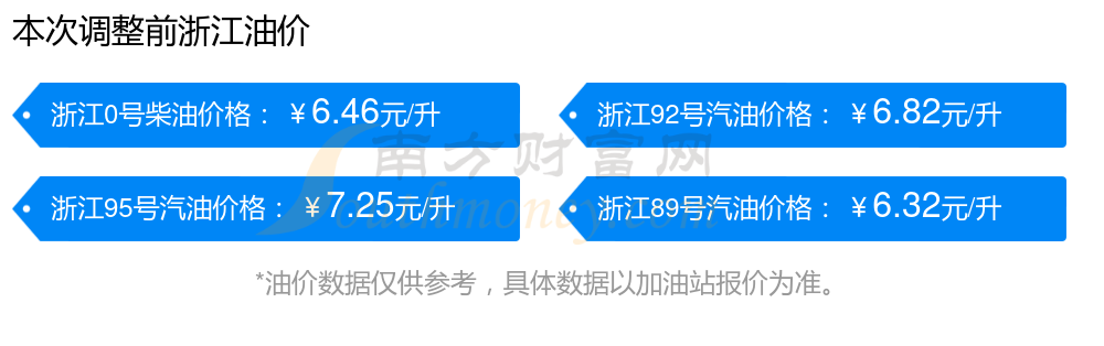11月12日,浙江汽油、柴油的價格為11月11日調(diào)整后的價格。具體為:92號汽油6.92元,升了0.1元;95號汽油7.36元,升了0.11元;89號汽油6.41元,升了0.09;0號柴油6.57元,升了0.11元。