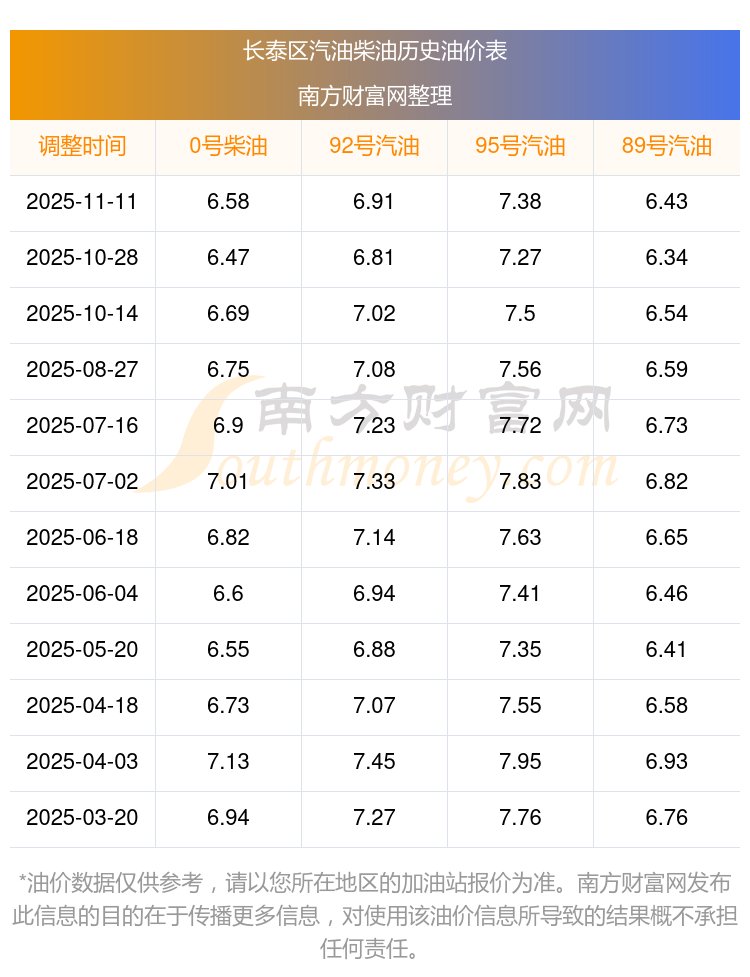 油價(jià)調(diào)整最新消息:下一輪油價(jià)調(diào)整時(shí)間11月24日24時(shí)。長泰區(qū)汽油、柴油11月12日每升的價(jià)格是多少?11月11日調(diào)整后的價(jià)格詳情如下:92號(hào)汽油6.91元;95號(hào)汽油7.38元;89號(hào)汽油6.43元;0號(hào)柴油6.58元。