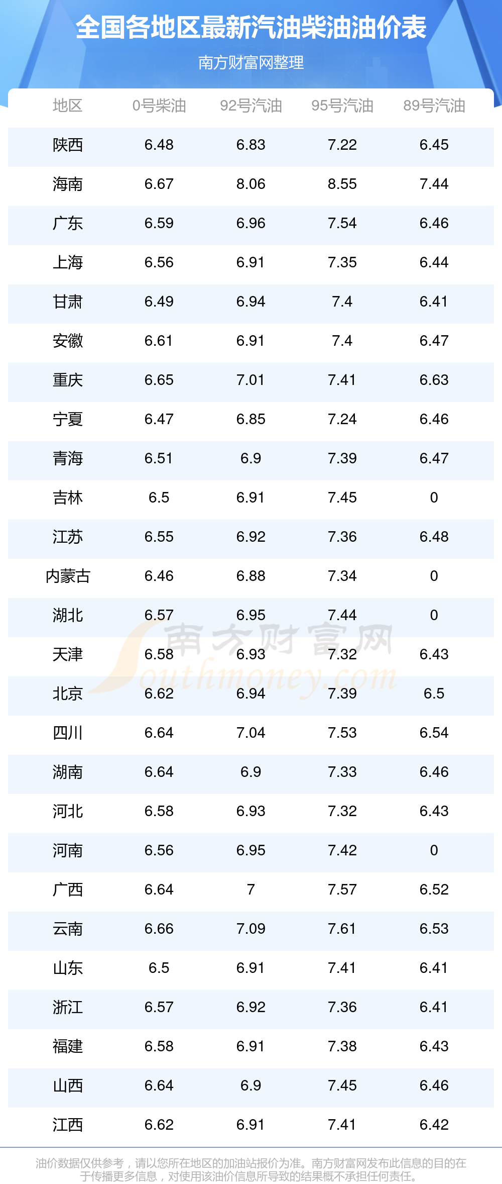 全國89號汽油平均價(jià)格為:7元每升,其中,最低為浙江,價(jià)格6.41元/升,最高為海南,價(jià)格7.44元/升。