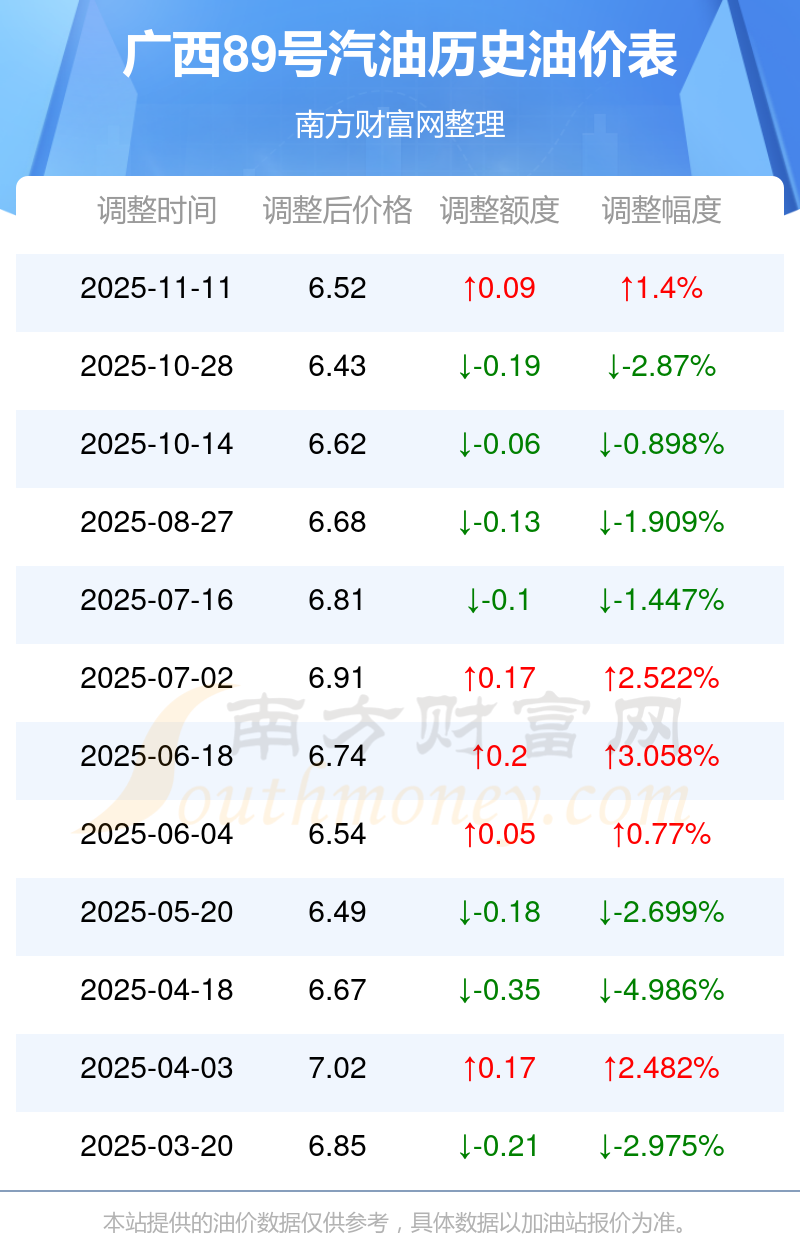 11月12日,廣西89號汽油的價格是6.52元每升,本次的調(diào)整時間為11月11日,對比上次的調(diào)整增了0.09元,增1.4%,11月24日24時為下一輪油價調(diào)整時間,還有12.26天。