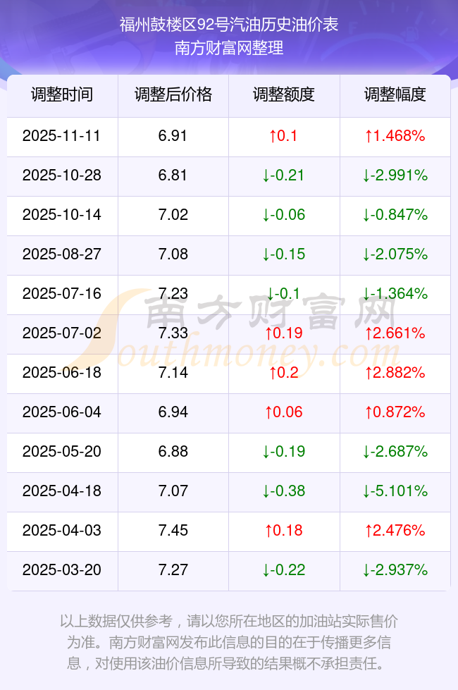 11月12日福州鼓樓區(qū)92號汽油歷史油價一覽表