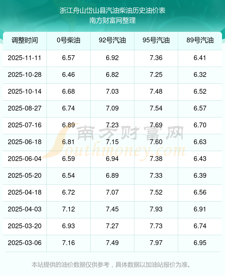 2025年浙江舟山岱山縣汽油價(jià)格一覽表
