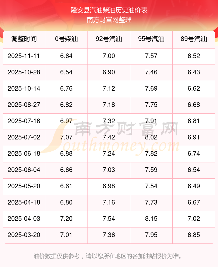 隆安縣汽油、柴油11月12日每升的價格為(本輪油價調整時間為11月11日):92號汽油7元;95號汽油7.57元;89號汽油6.52元;0號柴油6.64元。