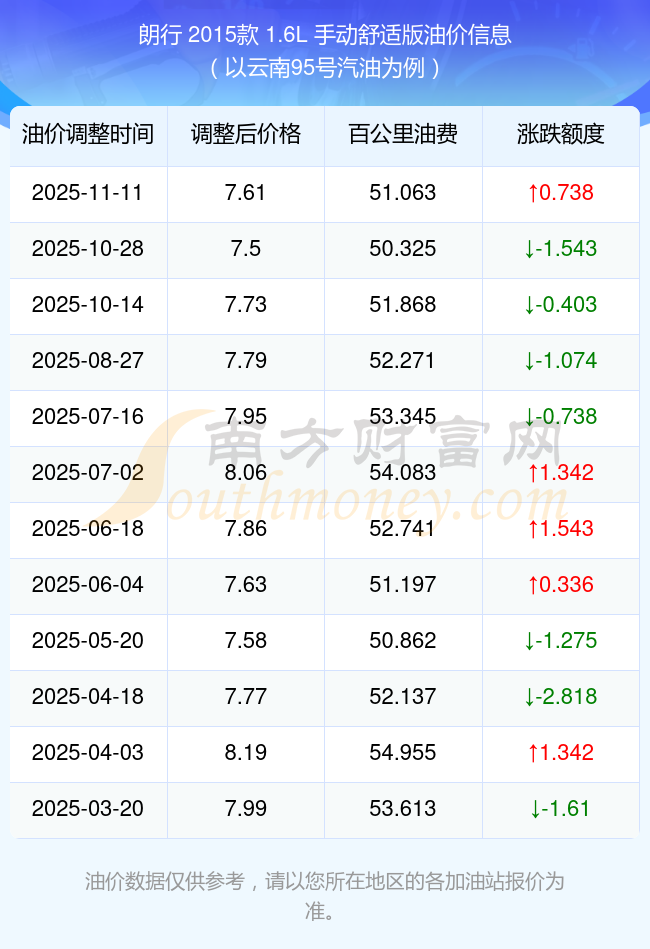 按11月11日95號汽油最新調(diào)整價格7.61元每升來計算(以云南為例),該車型百公里平均油費為51.063元,按上一輪10月28日調(diào)整價格7.5元每升來計算,百公里平均油費為50.325元,對比上一輪多花0.738元,下一輪油價調(diào)整時間為11月24日24時。