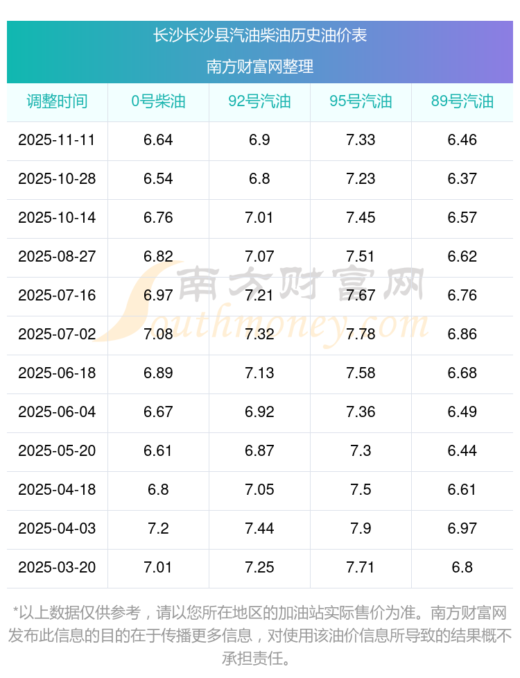 油價調(diào)整最新消息:下一輪油價調(diào)整時間11月24日24時。長沙長沙縣汽油、柴油11月12日每升的價格為11月11日調(diào)整后的價格,具體油價為:92號汽油6.9元;95號汽油7.33元;89號汽油6.46元;0號柴油6.64元。