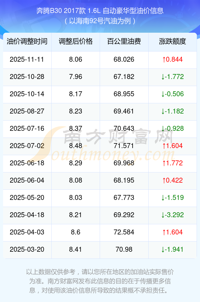按照11月11日92號汽油最新調(diào)整價格8.06元/升來計算(以海南為例),該車型百公里平均油費為68.026元,按照上一輪10月28日調(diào)整價格7.96元/升來計算,百公里平均油費為67.182元,對比上一輪多花0.844元,下一輪油價調(diào)整時間為11月24日24時。