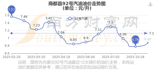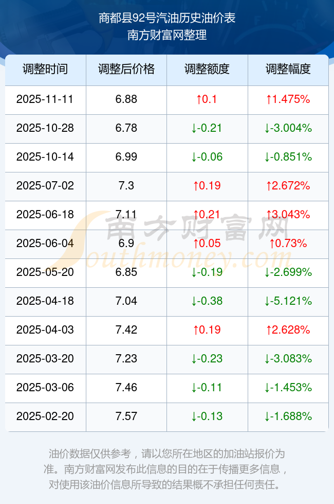 11月12日商都縣92號(hào)汽油的價(jià)格為11月11日油價(jià)調(diào)整后的價(jià)格,每升6.88元,對(duì)比上一輪油價(jià)調(diào)整時(shí)間10月28日的價(jià)格6.78元每升,上調(diào)了0.1元,上調(diào)幅達(dá)1.475%。
