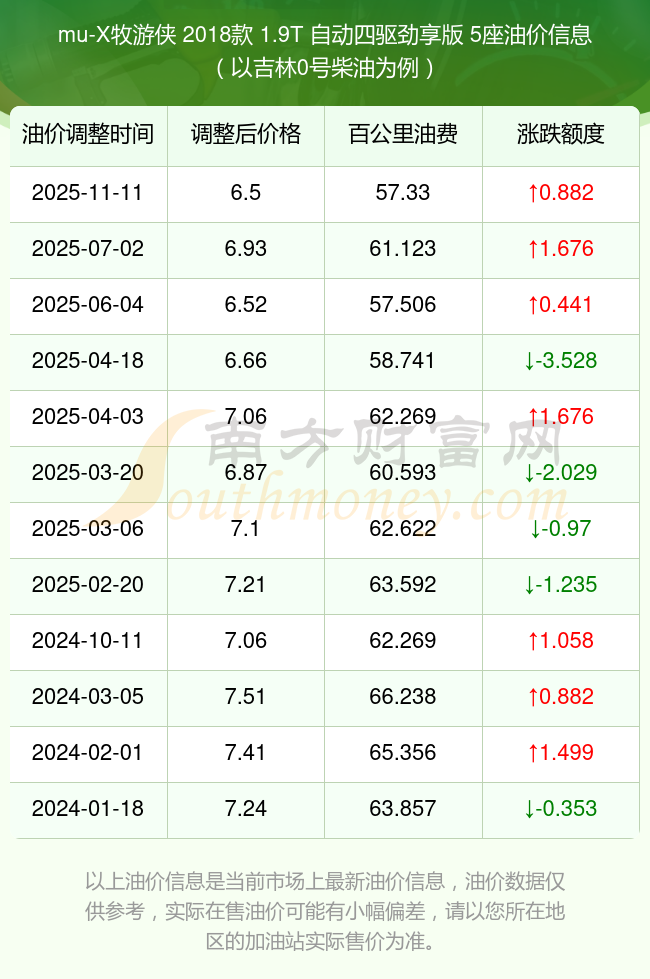 按11月11日0號柴油最新調(diào)整價格6.5元每升來計算(以吉林為例),該車型百公里平均油費為57.33元,按上一輪7月2日調(diào)整價格6.4元每升來計算,百公里平均油費為56.448元,對比上一輪多花0.882元,下一輪油價調(diào)整時間為11月24日24時。