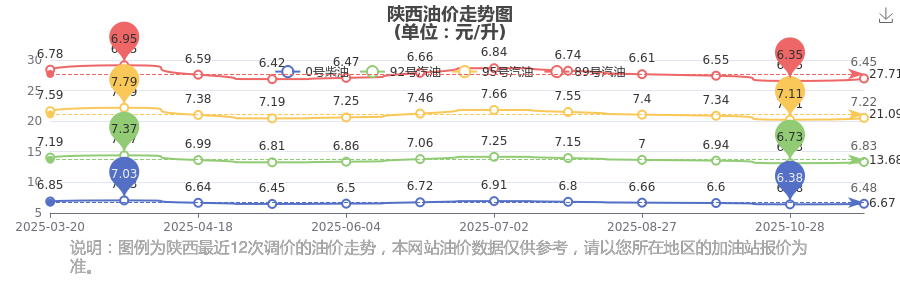 11月12日陜西汽油、柴油的價格多少錢一升?本輪油價調整時間是11月11日,92號汽油6.83元,上升了0.1元,上升幅達1.49%;95號汽油7.22元,上升了0.11元,上升幅達1.55%;89號汽油6.45元,上升了0.1元,上升幅達1.58%;0號柴油6.48元,上升了0.1元,上升幅達1.57%。