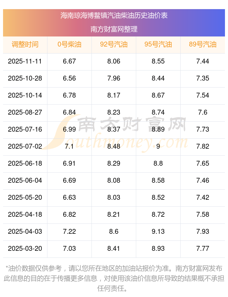 海南瓊海博鰲鎮(zhèn)歷史油價(jià)表
