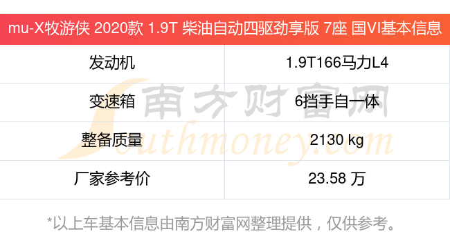 mu-X牧游俠 2020款 1.9T 柴油自動四驅(qū)勁享版 7座 國VI動力方面,搭載的是一臺1.9T166馬力L4渦輪增壓發(fā)動機(jī),匹配6擋手自一體自動檔變速箱,燃料形式為柴油,常規(guī)整備質(zhì)量2130kg,廠家參考價(jià)23.58萬元。