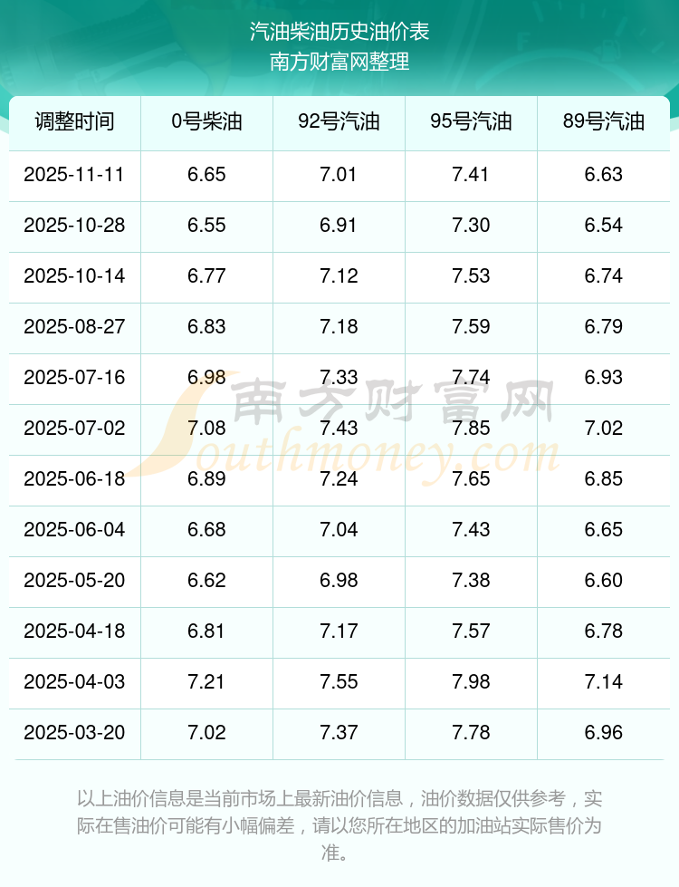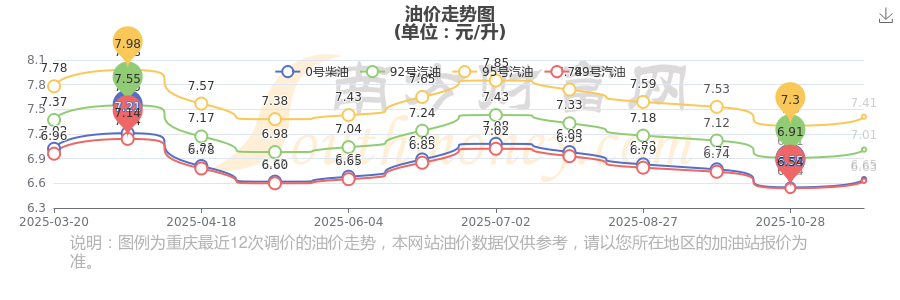 11月12日渝中95號(hào)汽油的價(jià)格為11月11日油價(jià)調(diào)整后的價(jià)格,具體是每升7.41元,相對(duì)上次調(diào)整時(shí)間10月28日的油價(jià)7.3元每升,共升了0.11元,升1.507%。下一輪油價(jià)調(diào)整時(shí)間11月24日24時(shí),距離現(xiàn)在還有12.2天。