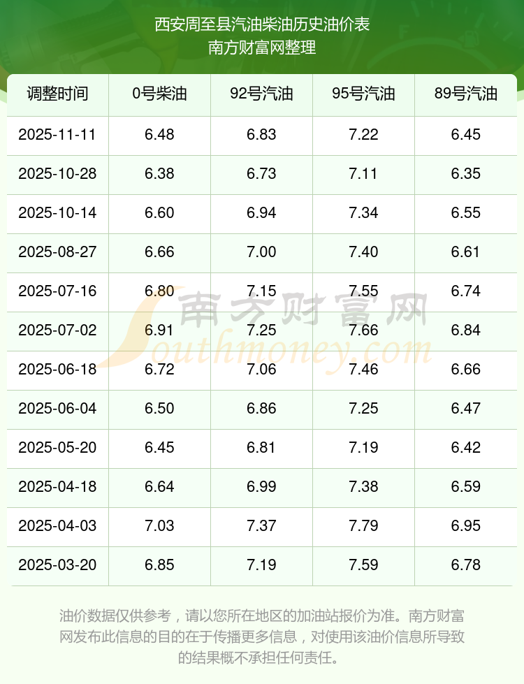 11月12日西安周至縣汽油、柴油價(jià)格是11月11日調(diào)整后的價(jià)格,每升價(jià)格具體為:92號汽油為6.83元,升了0.1元,升幅達(dá)1.49%;95號汽油為7.22元,升了0.11元,升幅達(dá)1.55%;89號汽油為6.45元,升了0.1元,升幅達(dá)1.58%;0號柴油為6.48元,升了0.1元,升幅達(dá)1.57%。