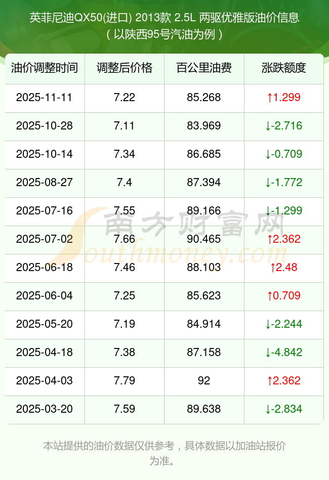 依照11月11日95號(hào)汽油最新調(diào)整價(jià)格7.22元/升來計(jì)算(以陜西為例),該車型百公里的平均油費(fèi)是85.268元,依照上一輪10月28日調(diào)整價(jià)格7.11元/升來計(jì)算,百公里的平均油費(fèi)是83.969元,對(duì)比上一輪多花1.299元,下一輪的油價(jià)調(diào)整時(shí)間11月24日24時(shí)。