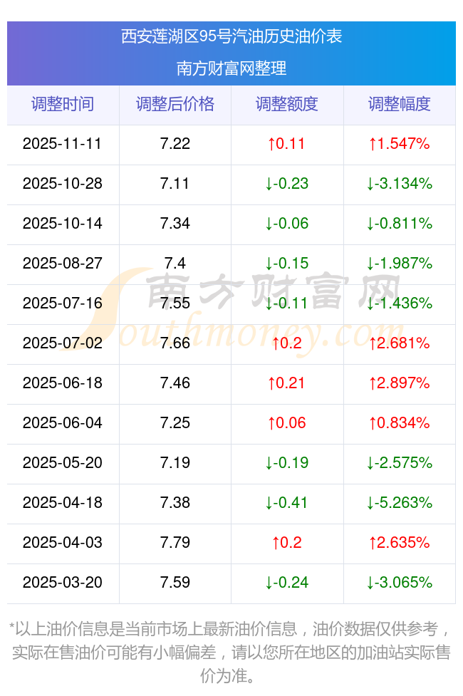 11月12日西安蓮湖區(qū)95號汽油的價格為7.22元每升,本次調整時間為11月11日,相對上次調整時間10月28日的油價7.11元每升,增了0.11元,增幅達1.547%。