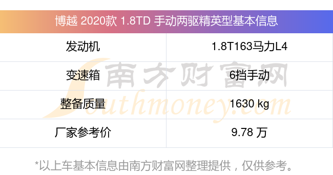博越 2020款 1.8TD 手動(dòng)兩驅(qū)精英型搭載了一臺(tái)1.8T163馬力L4渦輪增壓發(fā)動(dòng)機(jī),采用6擋手動(dòng)擋變速箱,常規(guī)整備質(zhì)量1630kg,廠家參考價(jià)9.78萬(wàn)元。