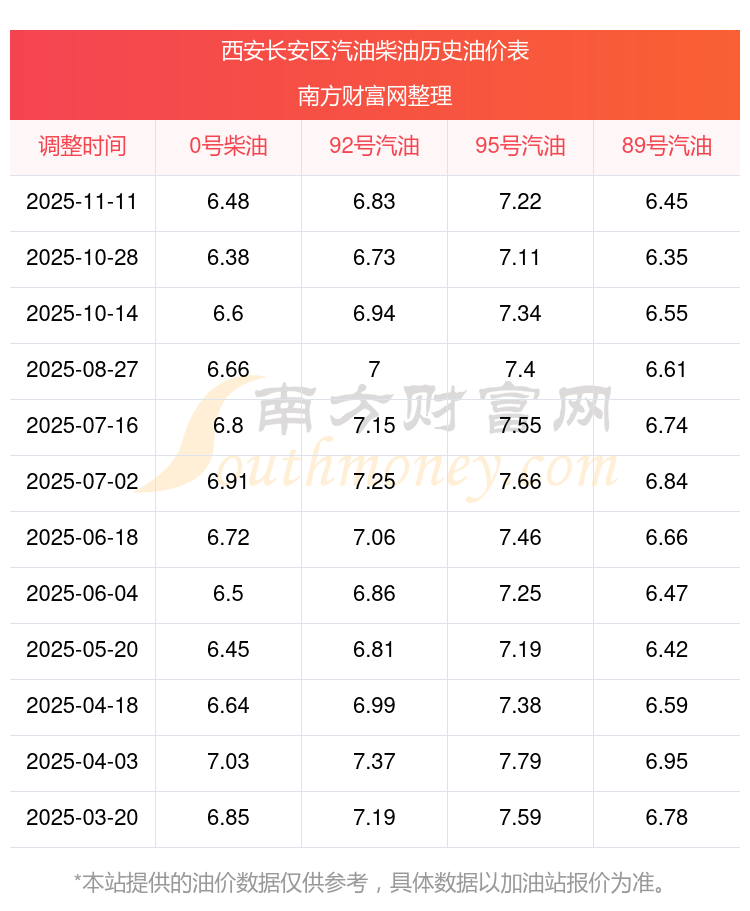 油價調(diào)整最新消息:下一輪油價調(diào)整時間11月24日24時。西安長安區(qū)11月12日汽油價格一覽:92號汽油6.83元;95號汽油7.22元;89號汽油6.45元;0號柴油6.48元(該價格為11月11日調(diào)整后的價格)。