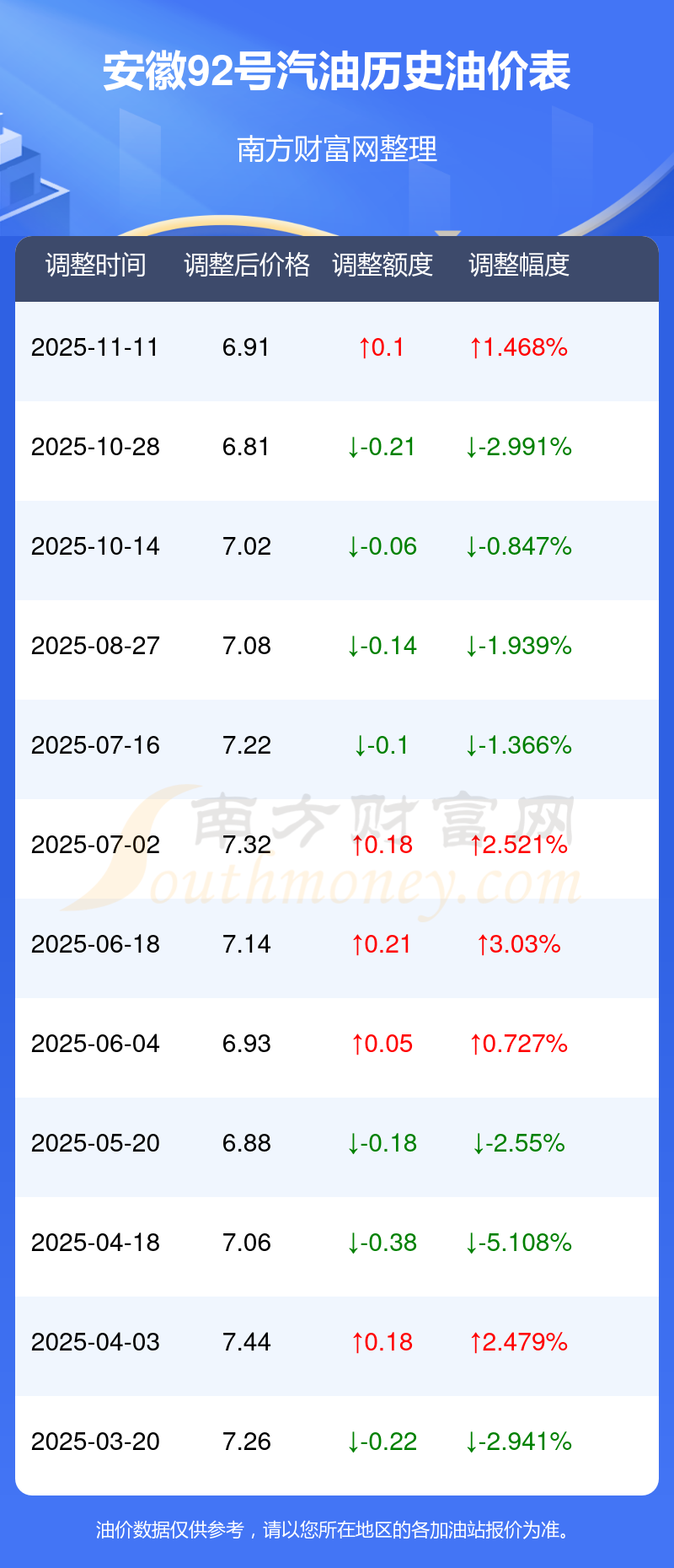 11月12日,安徽92號(hào)汽油的價(jià)格是6.91元每升,本次的調(diào)整時(shí)間為11月11日,對(duì)比上次的調(diào)整漲了0.1元,漲1.468%,11月24日24時(shí)為下一輪油價(jià)調(diào)整時(shí)間,還有12.16天。