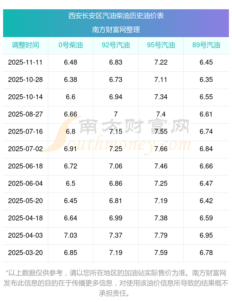 西安長安區(qū)汽油、柴油11月12日每升最新價格為:0號柴油為6.48元,上漲了0.1元;95號汽油為7.22元;92號汽油為6.83元;89號汽油為6.45元,調(diào)整時間為11月11日。