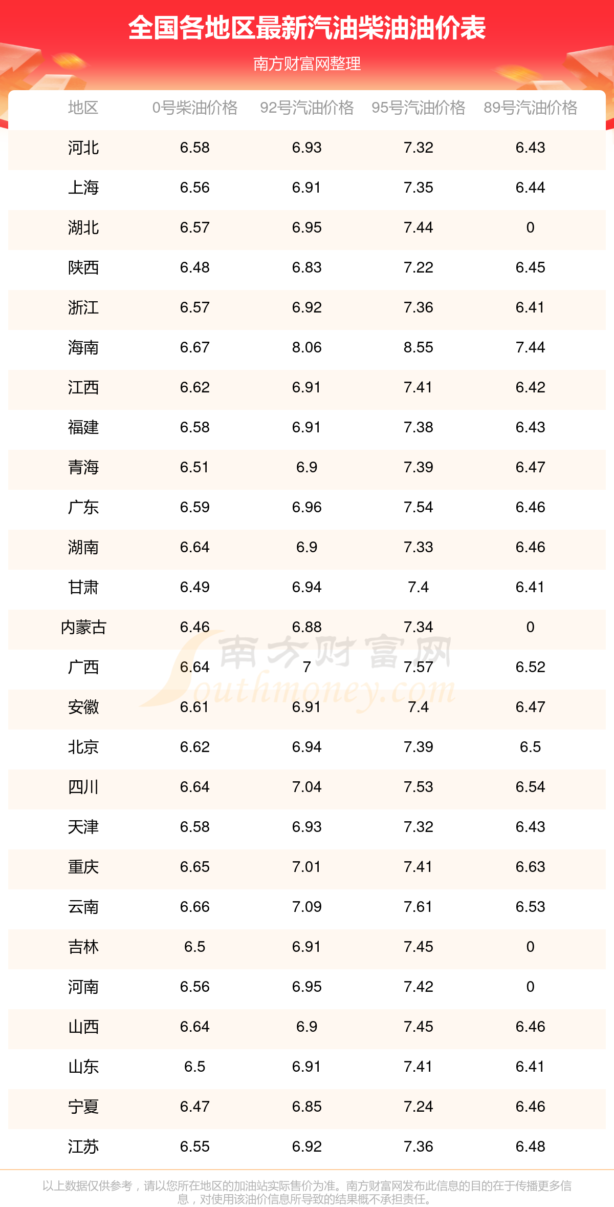 油價數(shù)據(jù)僅供參考,請以您所在地區(qū)的加油站報(bào)價為準(zhǔn)。南方財(cái)富網(wǎng)發(fā)布此信息的目的在于傳播更多信息,對使用該油價信息所導(dǎo)致的結(jié)果概不承擔(dān)任何責(zé)任。