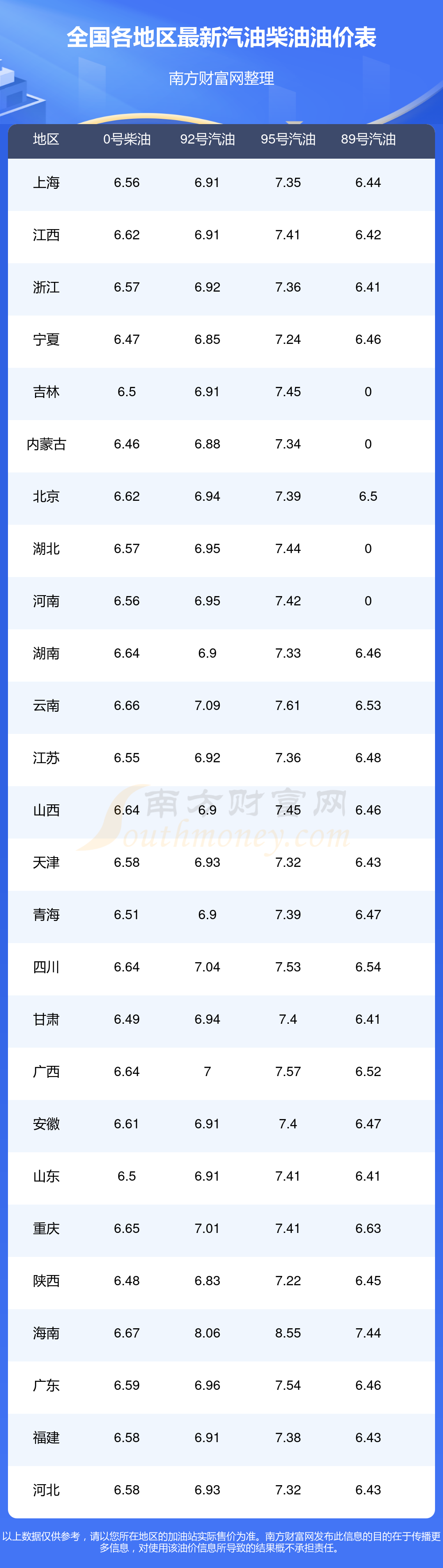 油價數(shù)據(jù)僅供參考,請以您所在地區(qū)的加油站報價為準。南方財富網(wǎng)發(fā)布此信息的目的在于傳播更多信息,對使用該油價信息所導致的結(jié)果概不承擔任何責任。