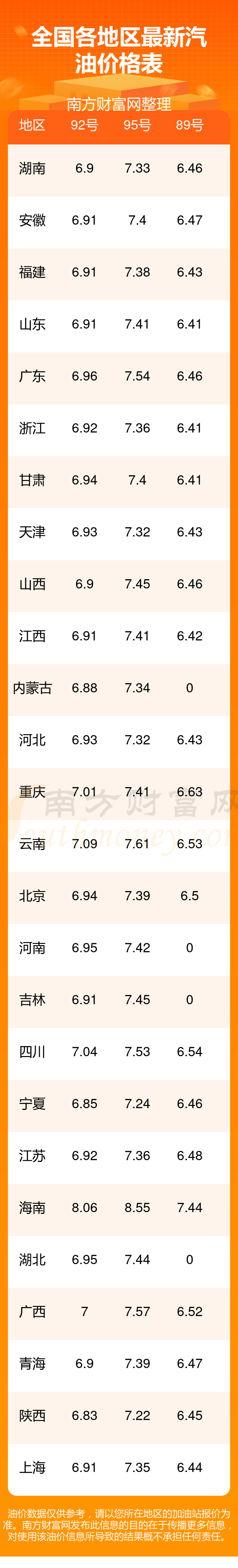 以上數(shù)據(jù)僅供參考,請以您所在地區(qū)的加油站實際售價為準。南方財富網(wǎng)發(fā)布此信息的目的在于傳播更多信息,對使用該油價信息所導致的結(jié)果概不承擔責任。