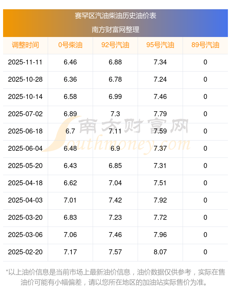 11月12日賽罕區(qū)汽油柴油每升的價(jià)格為11月11日調(diào)整后的價(jià)格,具體如下:92號(hào)汽油6.88元;95號(hào)汽油7.34元;0號(hào)柴油6.46元。