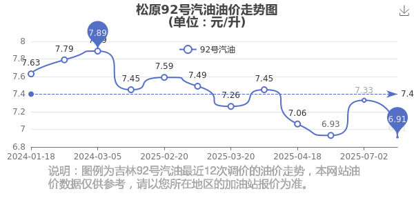 11月12日松原92號汽油價格:6.91元每升,調整時間為11月11日,相對上次調整上升了0.11元。