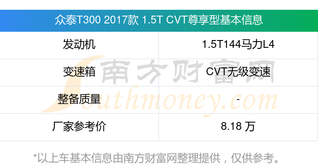 眾泰T300 2017款 1.5T CVT尊享型動力上配備的是一臺1.5T144馬力L4渦輪增壓發(fā)動機,匹配的是CVT無級變速自動檔變速箱,燃料形式為汽油,廠家參考價8.18萬元。