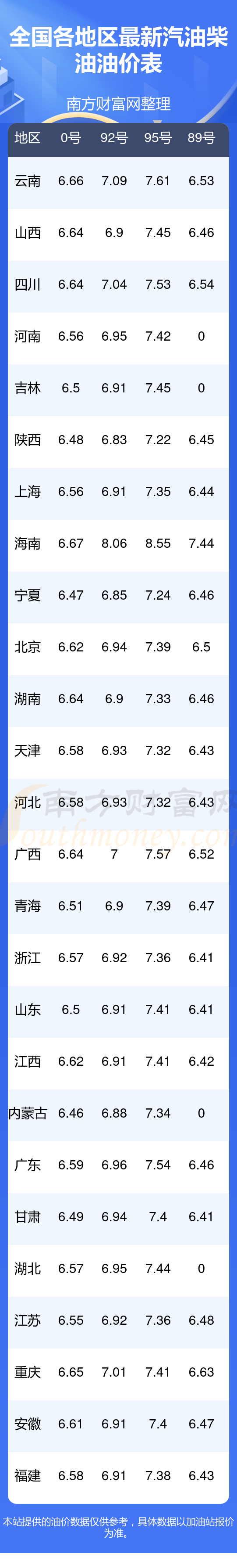 以上油價信息是當(dāng)前市場上最新油價信息,油價數(shù)據(jù)僅供參考,實際在售油價可能有小幅偏差,請以您所在地區(qū)的加油站實際售價為準(zhǔn)。