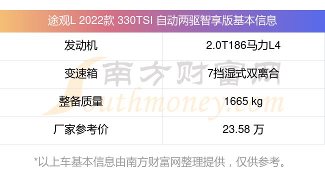 途觀L 2022款 330TSI 自動(dòng)兩驅(qū)智享版動(dòng)力上搭載的是一臺(tái)2.0T186馬力L4渦輪增壓發(fā)動(dòng)機(jī),匹配7擋濕式雙離合自動(dòng)檔變速箱,燃料形式為汽油,常規(guī)整備質(zhì)量1665kg,廠家參考價(jià)23.58萬(wàn)元。