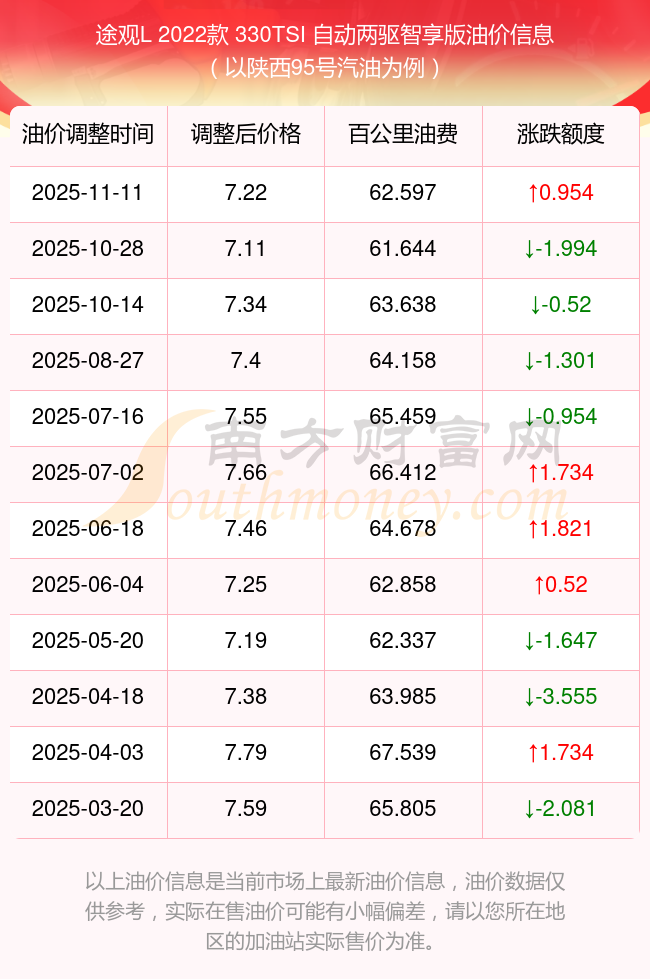 依照11月11日95號(hào)汽油最新調(diào)整價(jià)格7.22元/升來(lái)計(jì)算(以陜西為例),該車型百公里的平均油費(fèi)是62.597元,依照上一輪10月28日調(diào)整價(jià)格7.11元/升來(lái)計(jì)算,百公里的平均油費(fèi)是61.644元,對(duì)比上一輪多花0.954元,下一輪的油價(jià)調(diào)整時(shí)間11月24日24時(shí)。