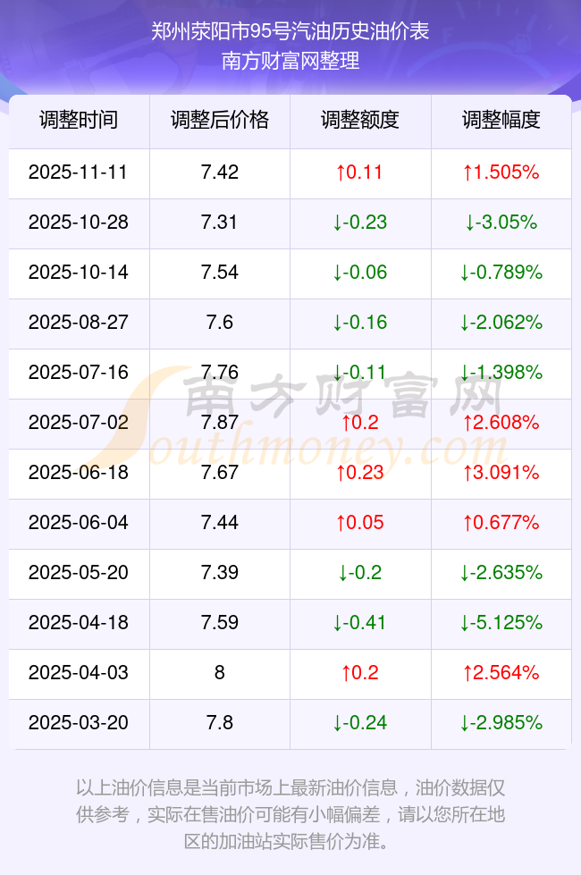 鄭州滎陽市11月12日95號(hào)汽油歷史油價(jià)調(diào)整一覽表