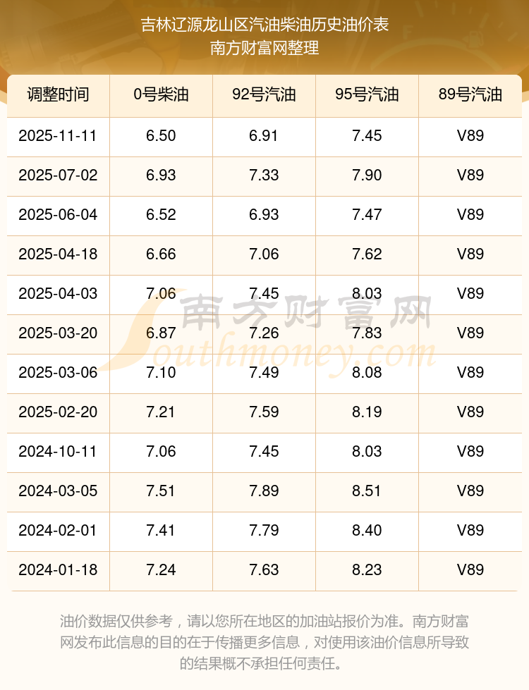 吉林遼源龍山區(qū)歷史油價(jià)表