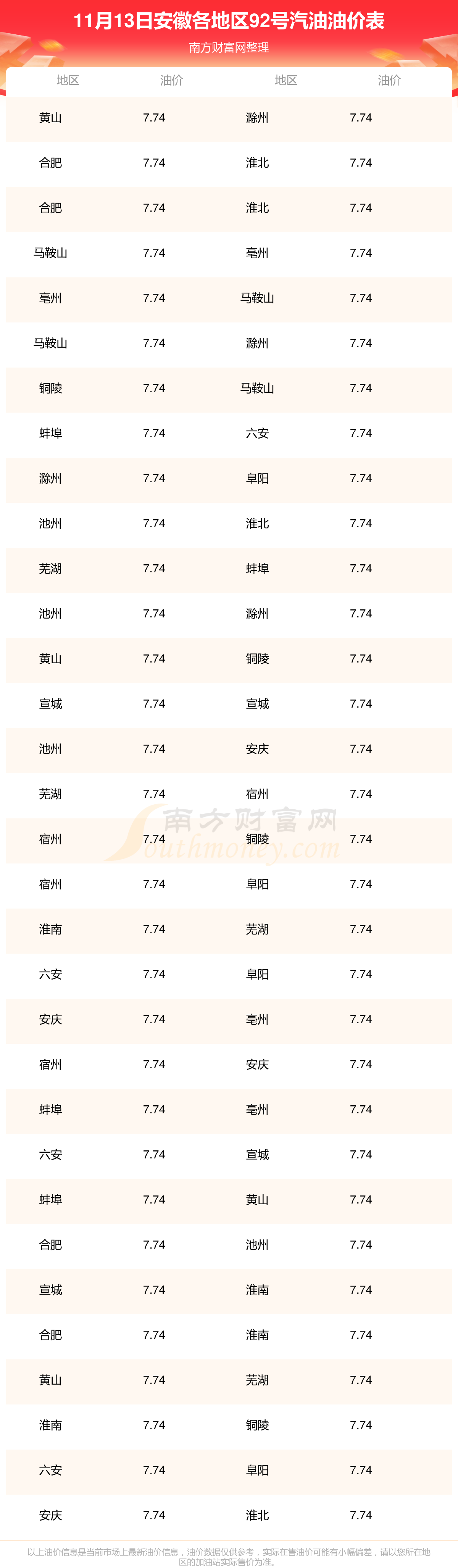 安徽各地區(qū)最新92號(hào)汽油油價(jià)表