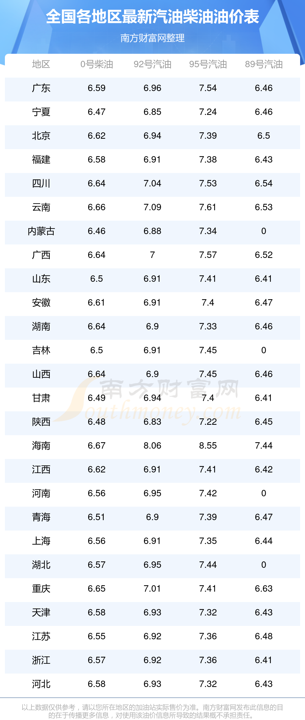 0號(hào)柴油平均價(jià)格:7元每升,其中,最高為海南,價(jià)格為6.67元/升,最低為內(nèi)蒙古,價(jià)格為6.46元/升。