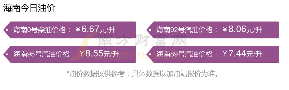 油價(jià)數(shù)據(jù)僅供參考,請(qǐng)以您所在地區(qū)的加油站報(bào)價(jià)為準(zhǔn)。南方財(cái)富網(wǎng)發(fā)布此信息的目的在于傳播更多信息,對(duì)使用該油價(jià)信息所導(dǎo)致的結(jié)果概不承擔(dān)任何責(zé)任。