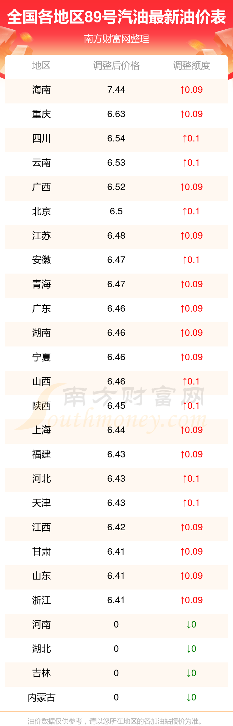 全國(guó)各地區(qū)最新89號(hào)汽油油價(jià)表