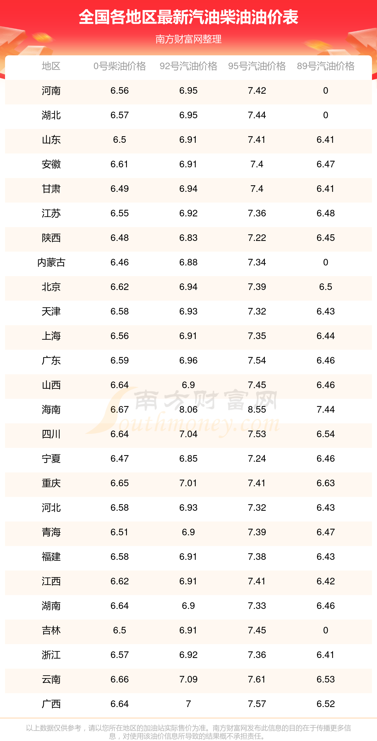 油價數據僅供參考,請以您所在地區(qū)的加油站報價為準。南方財富網發(fā)布此信息的目的在于傳播更多信息,對使用該油價信息所導致的結果概不承擔任何責任。