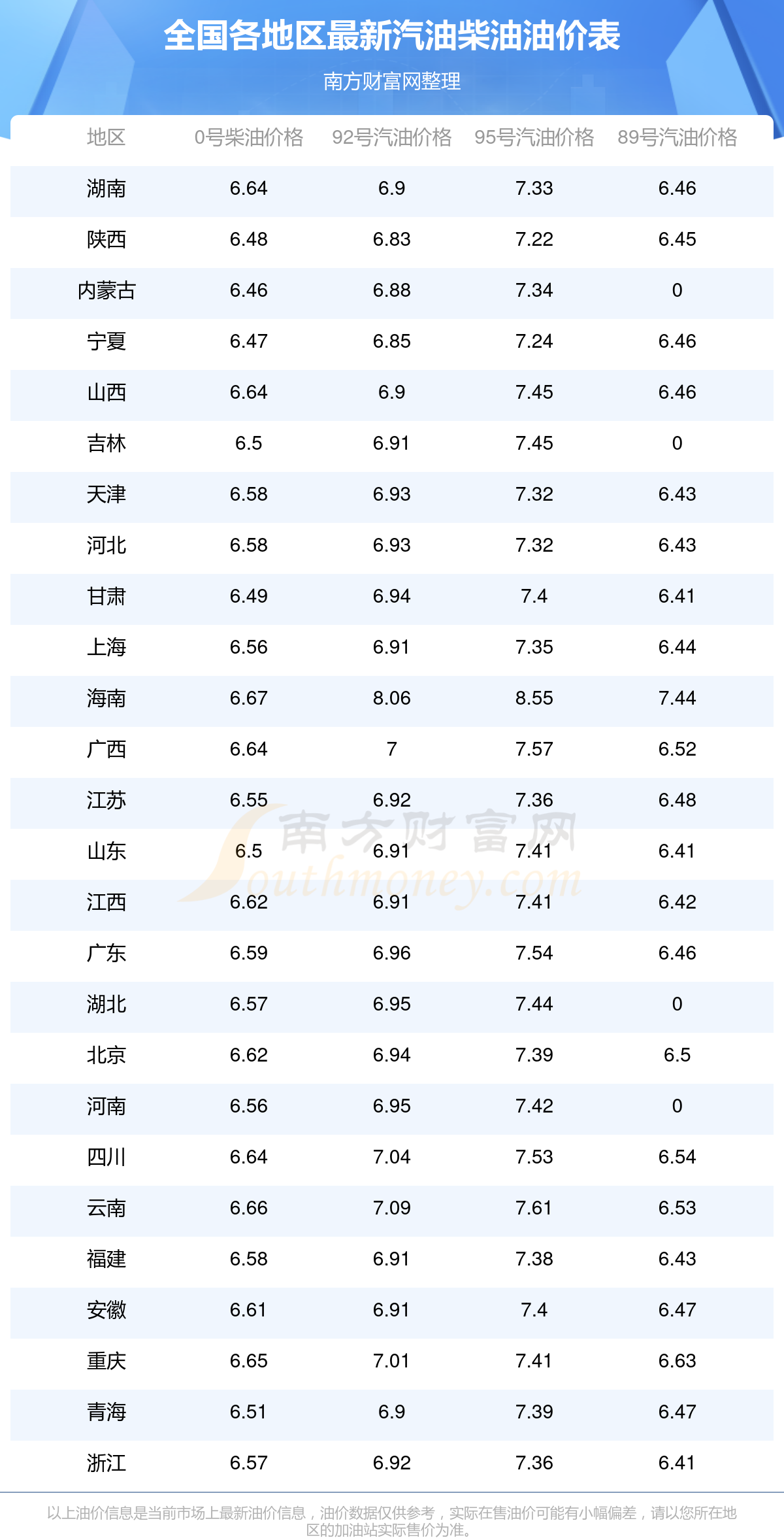 以上油價(jià)信息是當(dāng)前市場(chǎng)上最新油價(jià)信息,油價(jià)數(shù)據(jù)僅供參考,實(shí)際在售油價(jià)可能有小幅偏差,請(qǐng)以您所在地區(qū)的加油站實(shí)際售價(jià)為準(zhǔn)。