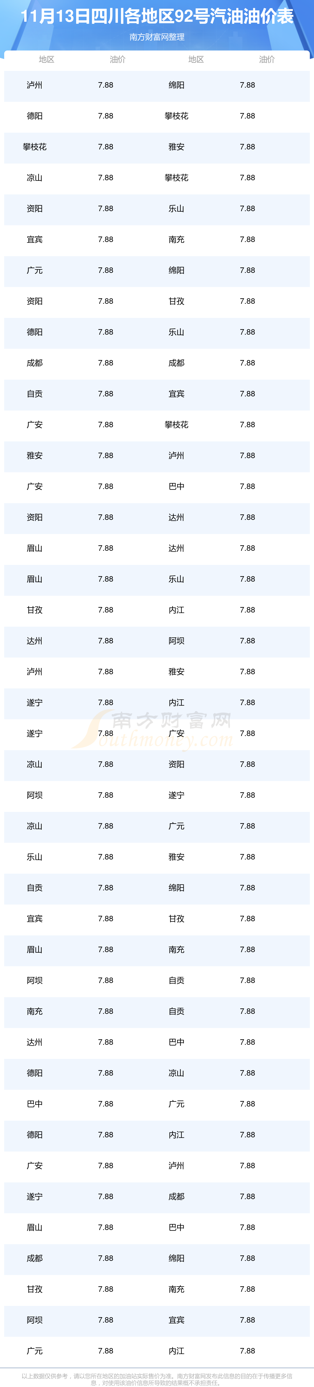四川各地區(qū)最新92號(hào)汽油油價(jià)表