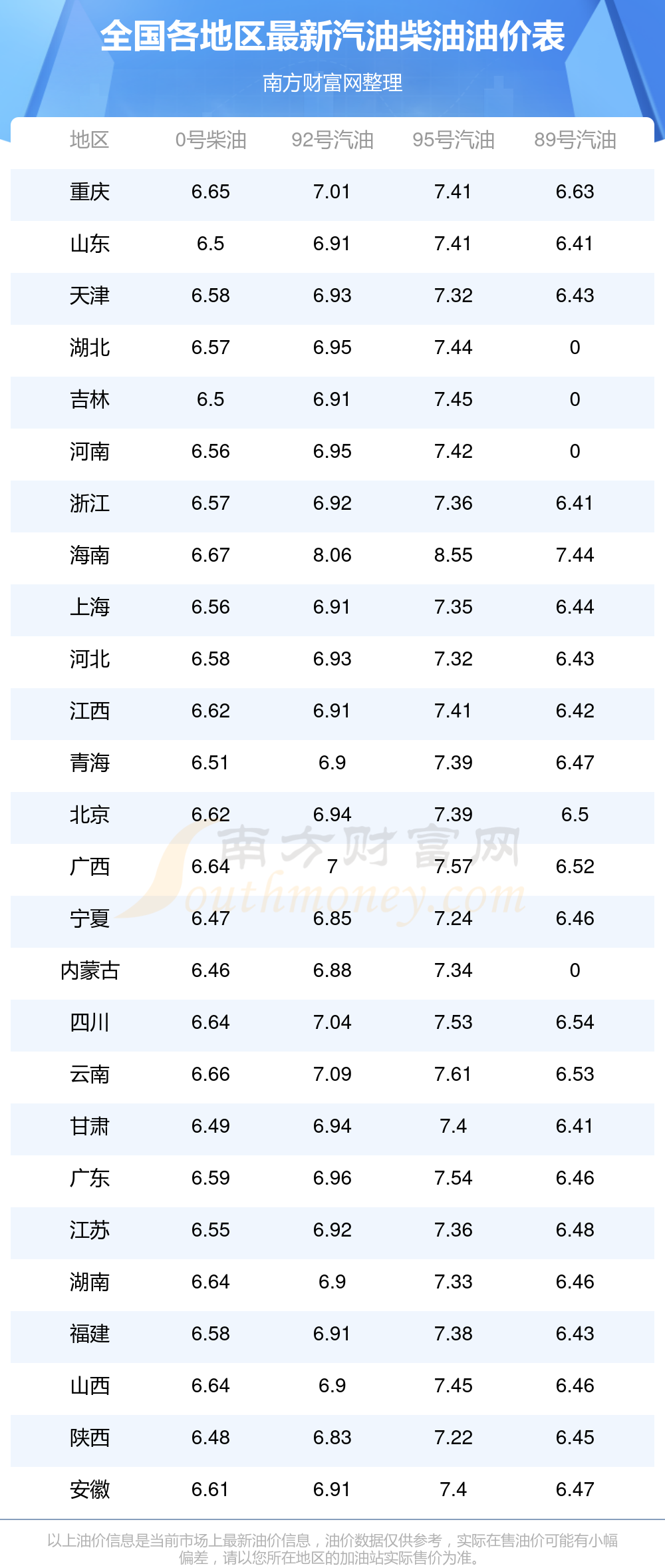 全國(guó)各地區(qū)2025年最新油價(jià)表
