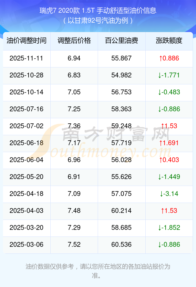 按11月11日92號汽油最新調(diào)整價格6.94元每升來計算(以甘肅為例),該車型百公里平均油費為55.867元,按上一輪10月28日調(diào)整價格6.83元每升來計算,百公里平均油費為54.982元,對比上一輪多花0.886元,下一輪油價調(diào)整時間為11月24日24時。