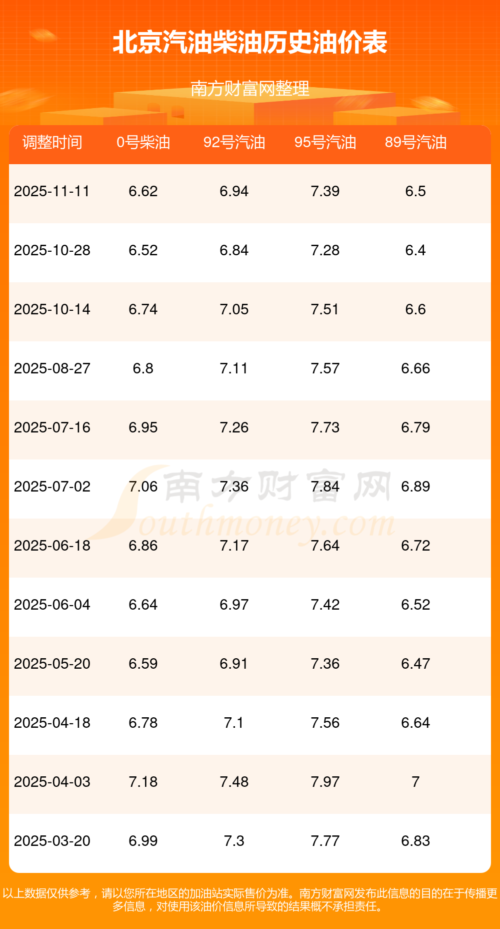 北京汽油、柴油11月13日每升最新價(jià)格為:92號(hào)汽油為6.94元;95號(hào)汽油為7.39元;89號(hào)汽油為6.5元;0號(hào)柴油為6.62元,調(diào)整時(shí)間為11月11日。