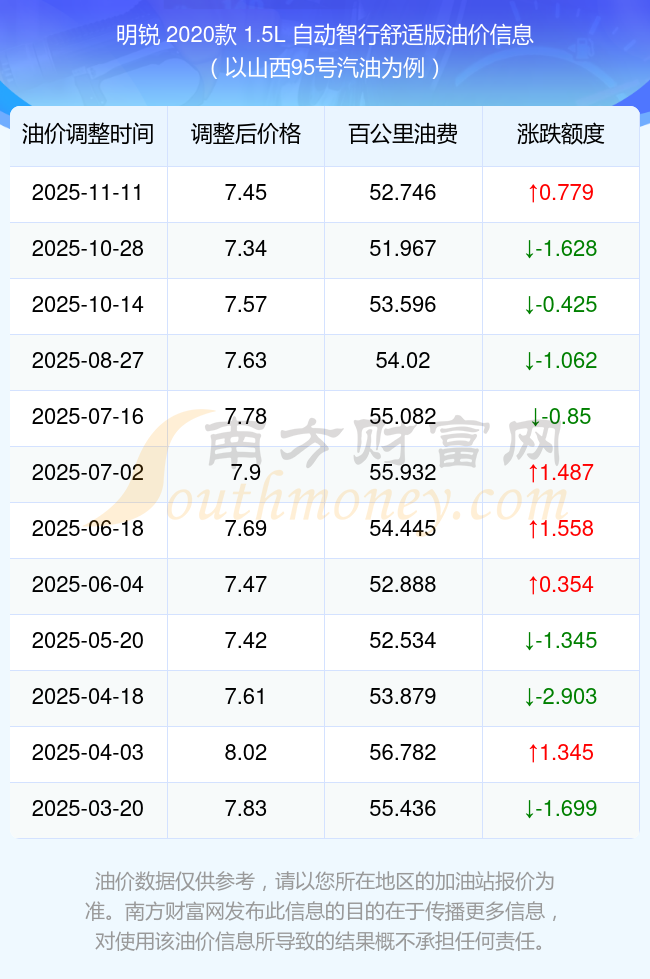 根據(jù)11月11日95號(hào)汽油最新調(diào)整價(jià)格7.45元/升來計(jì)算(以山西為例),該車型每百公里的平均油費(fèi)是52.746元,上一輪10月28日調(diào)整價(jià)格7.34元每升來計(jì)算,每百公里的平均油費(fèi)是51.967元,對(duì)比上一輪多花0.779元,下一輪的油價(jià)調(diào)整時(shí)間是11月24日24時(shí)。