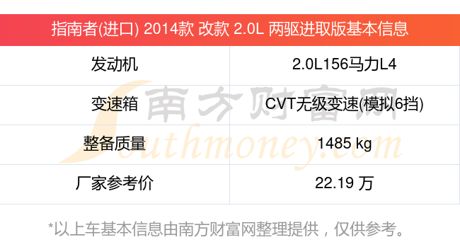 指南者(進口) 2014款 改款 2.0L 兩驅(qū)進取版動力上搭載的是一臺2.0L156馬力L4自然吸氣發(fā)動機,匹配CVT無級變速(模擬6擋)自動檔變速箱,燃料形式為汽油,常規(guī)整備質(zhì)量1485kg,廠家參考價22.19萬元。