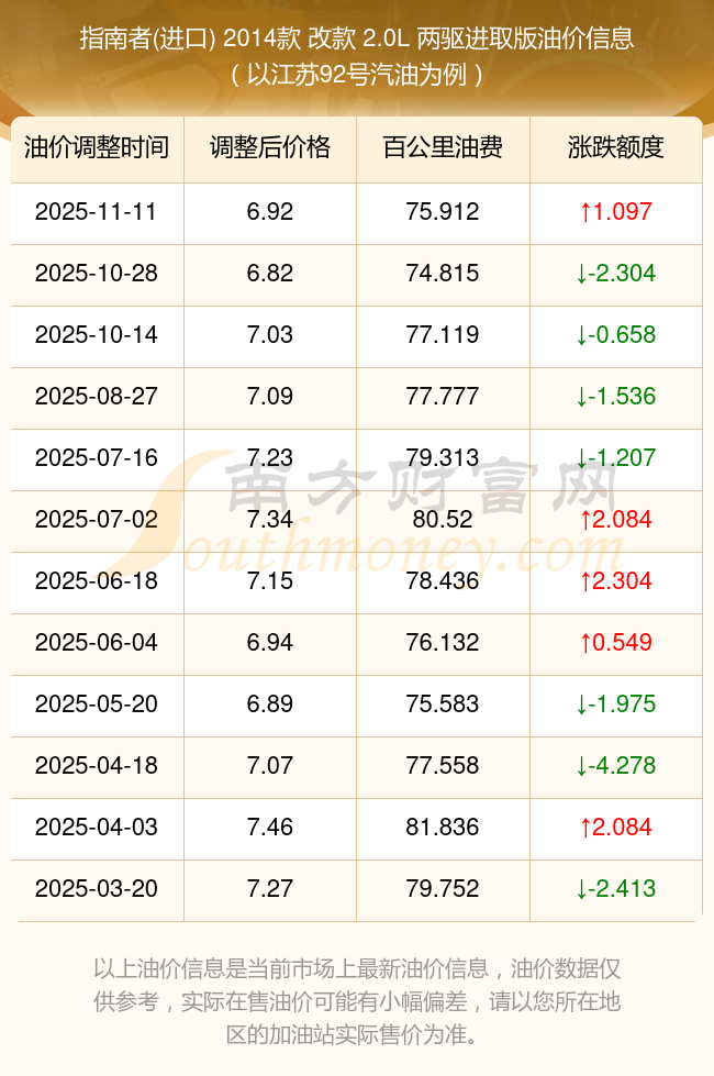 按11月11日92號汽油最新調(diào)整價格6.92元每升來計算(以江蘇為例),該車型百公里平均油費為75.912元,按上一輪10月28日調(diào)整價格6.82元每升來計算,百公里平均油費為74.815元,對比上一輪多花1.097元,下一輪油價調(diào)整時間為11月24日24時。