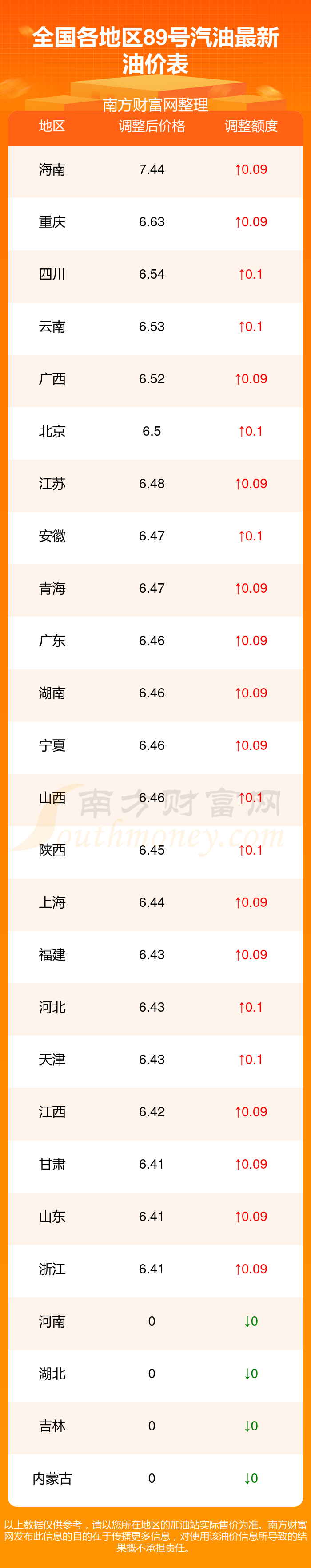 油價數(shù)據(jù)僅供參考,請以您所在地區(qū)的加油站報(bào)價為準(zhǔn)。南方財(cái)富網(wǎng)發(fā)布此信息的目的在于傳播更多信息,對使用該油價信息所導(dǎo)致的結(jié)果概不承擔(dān)任何責(zé)任。